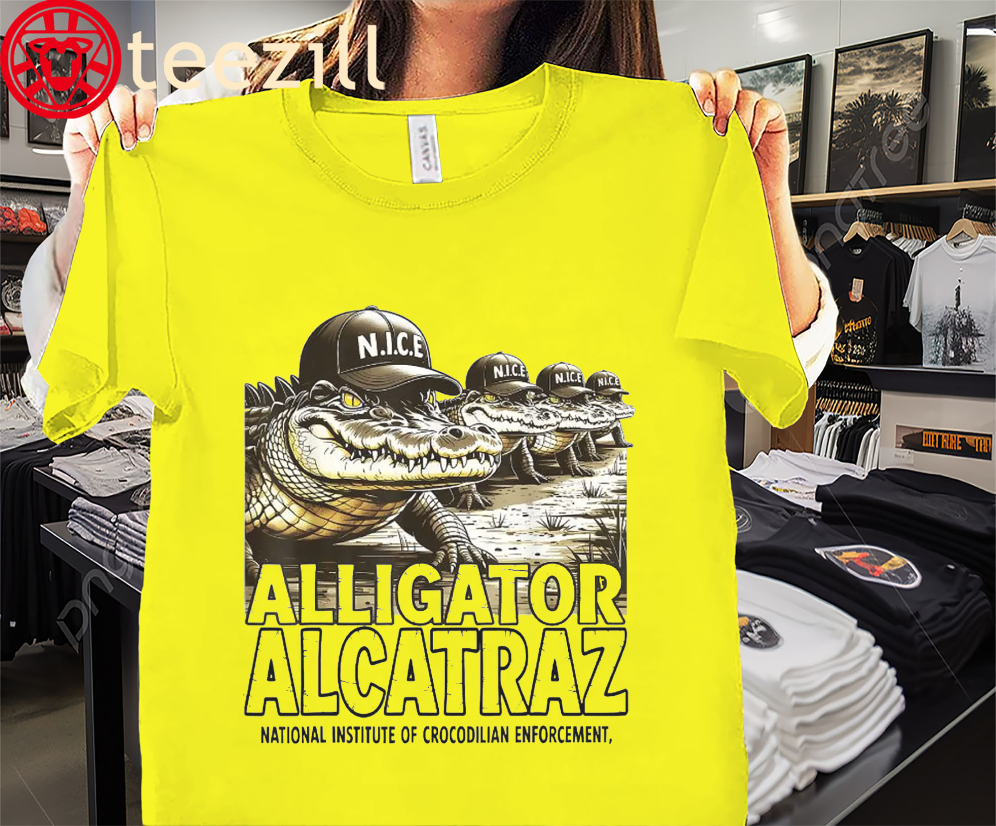 From the depths of the swamp to the edge of imagination, the Alligator Alcatraz Tee brings Florida folklore to life with a hilarious twist. Inspired by Everglades legends and tourist-trap fantasy, this parody shirt reimagines America’s most famous prison… run by gators.
