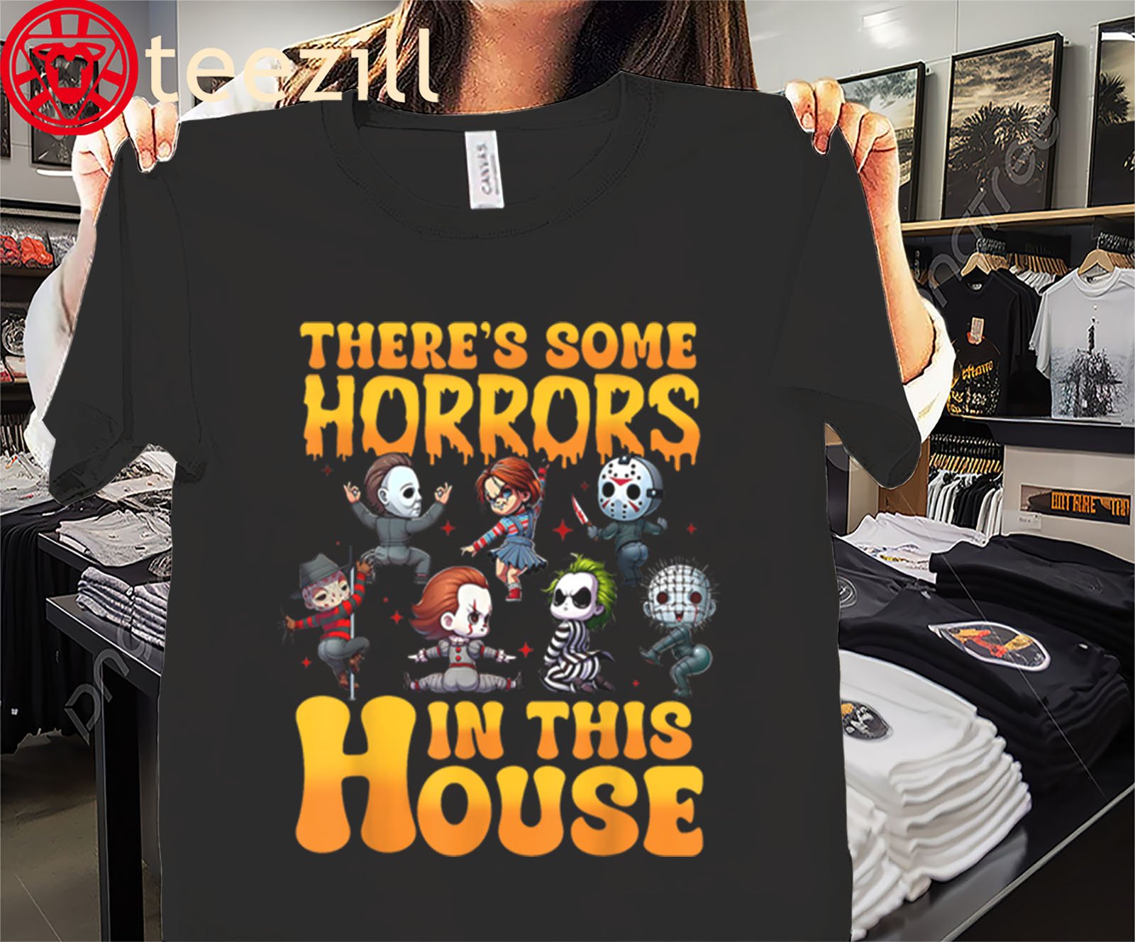 Show off your love for classic slasher icons with the “There’s Some Horrors in This House” Shirt. Featuring a lineup of your favorite horror movie characters in a humorous mashup design, this tee is perfect for Halloween parties, haunted house trips, or just repping spooky season all year long.