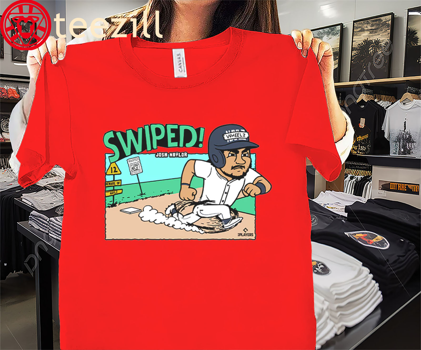 The Josh Naylor Swiped Bags Caricature Shirt brings big-league energy to your game-day fit. Featuring a bold caricature design of Naylor in action, this tee celebrates his hustle and base-stealing flair — a perfect mix of baseball art and fan pride.