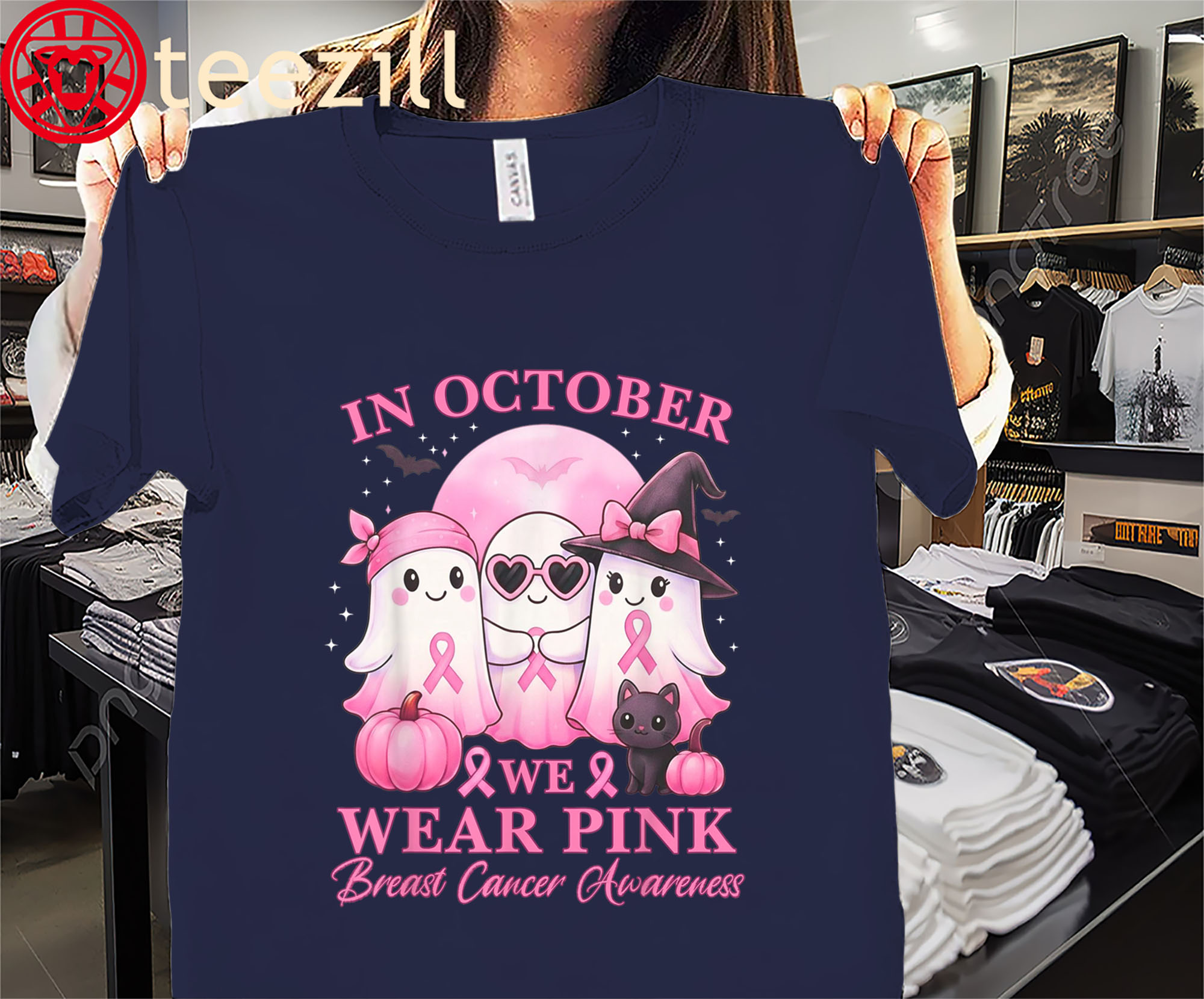 October We Wear Pink Ghost Squad Breast Cancer Awareness Tee Shirt