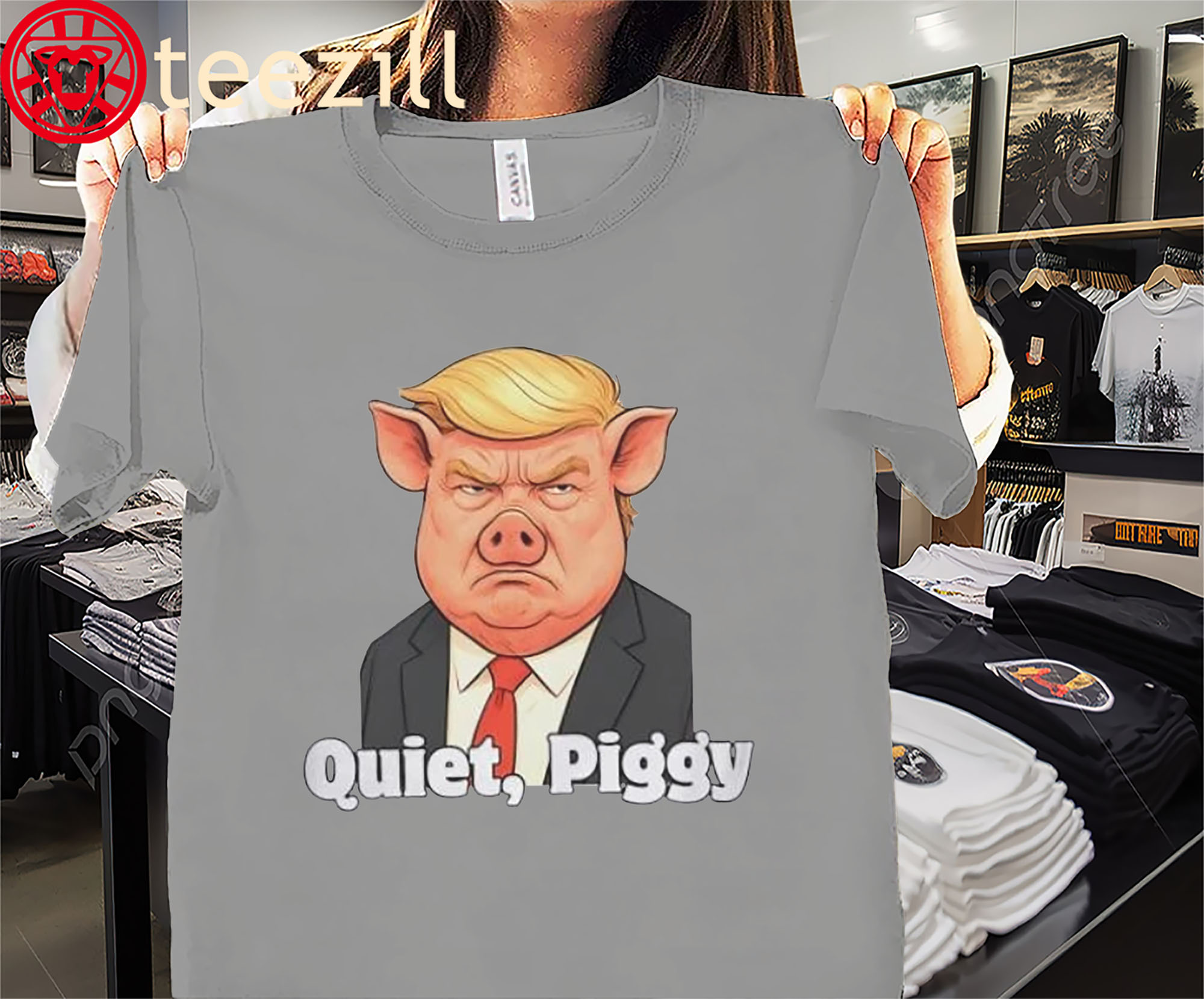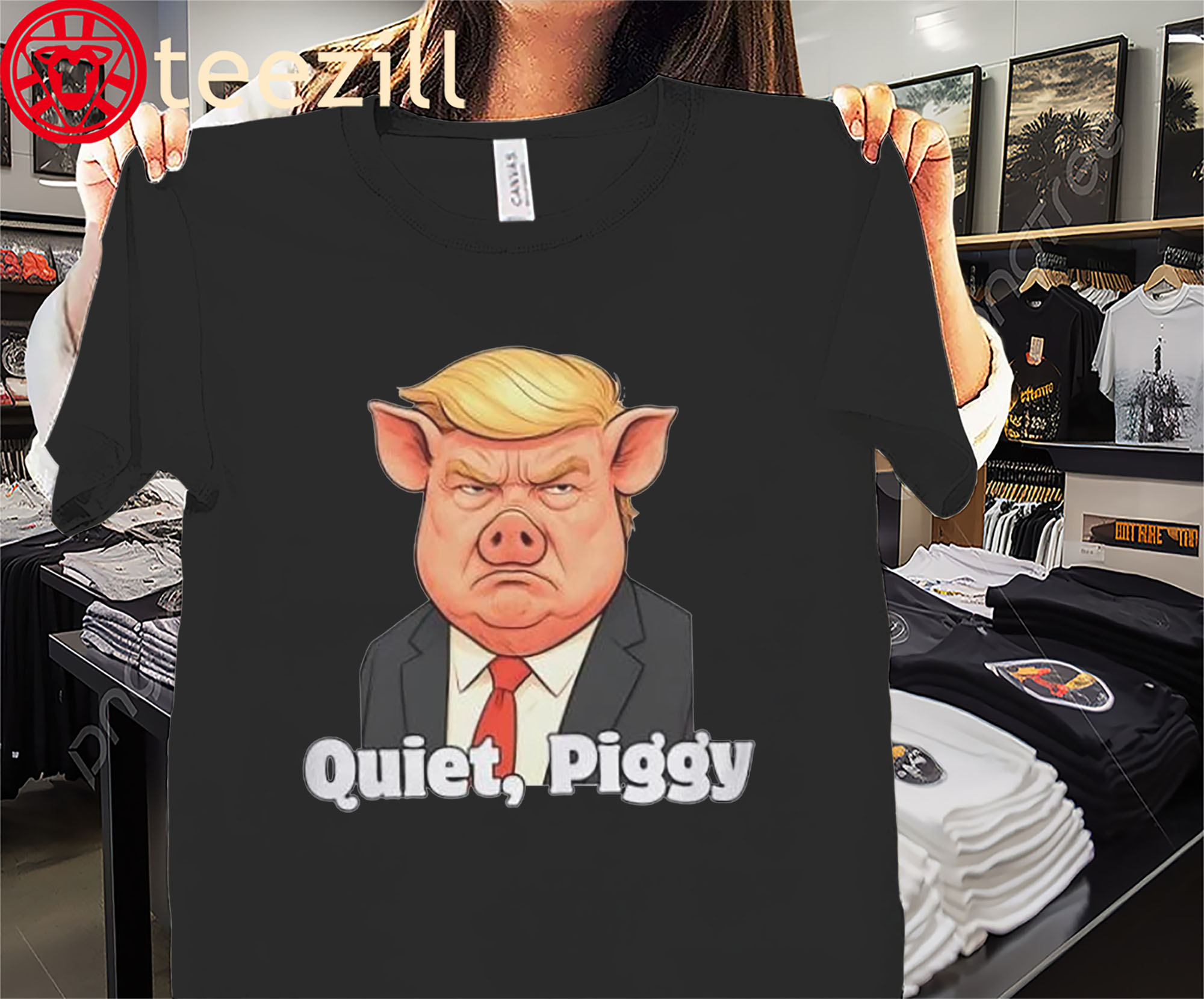 Make a bold and humorous statement with the Quiet Piggy, Pig Trump Tee Shirt—a satirical, poster-style design inspired by the viral “Quiet Piggy” meme. Perfect for fans of political humor, parody art, and eye-catching graphics, this tee adds personality and attitude to any outfit.