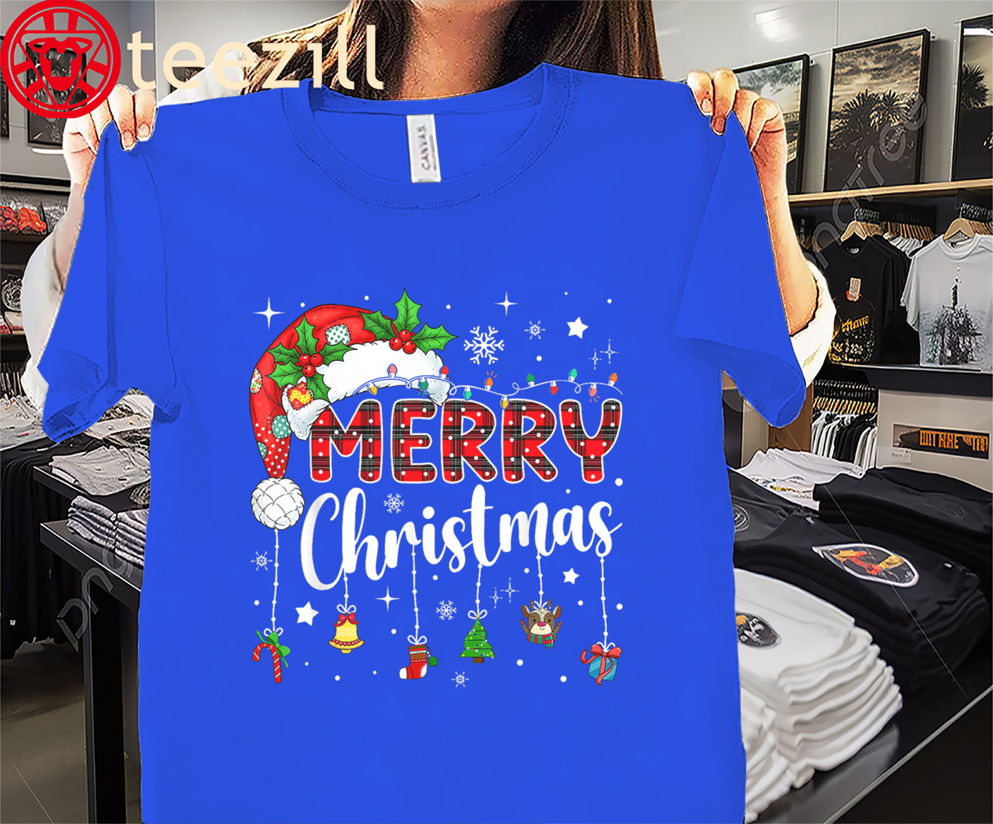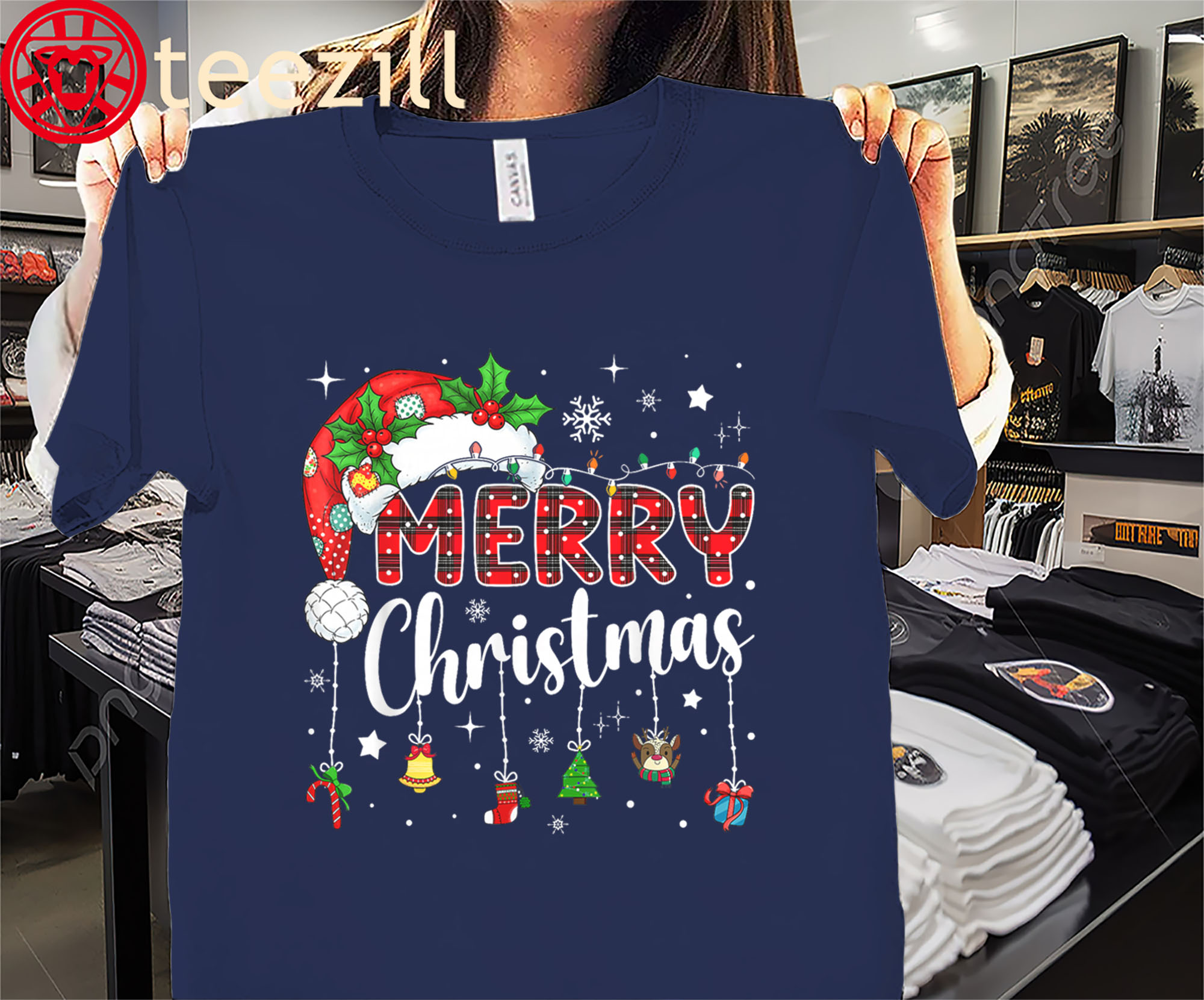 Red Santa Hat Reindeer Xmas Matching Family Shirt Merry Christmas 2025 Tee