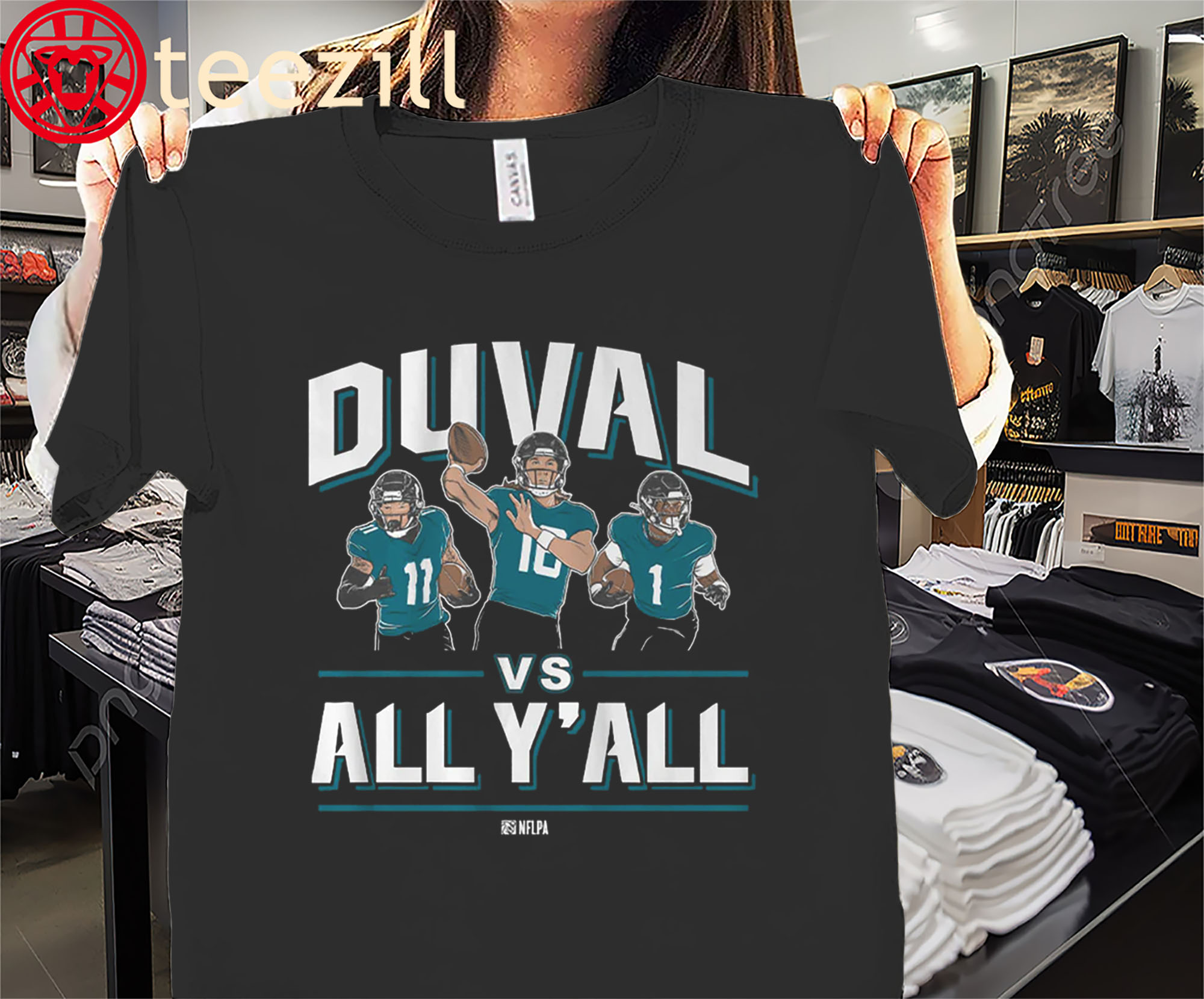 Stand on business for Duval with the Trevor Lawrence, Travis Etienne & Parker Washington “Duval vs. All Y’all” Premium Tee. Featuring Jacksonville’s electric offensive trio, this shirt is made for fans who bring the energy everywhere they go.